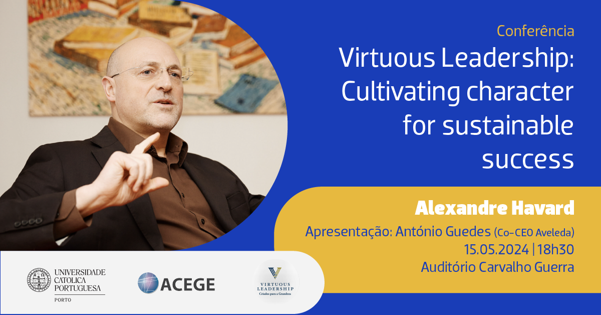 Esta conferência, proferida por Alexandre Havard conta com a apresentação de António Guedes (Co-CEO Aveleda), realiza-se no dia 15-05-2024, às 18h30, no Auditório Carvalho Guerra, da Universidade Católica no Porto.